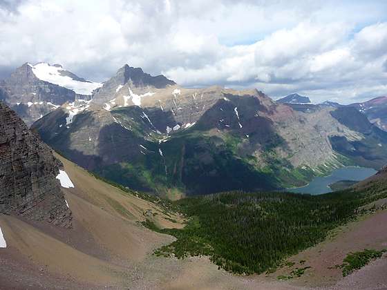 Hikers emerging from the north side of the tunnel are greeted by views of the stunningly beautiful Belly River Valley where Elizabeth Lake lies cradled in a forested bowl. Natoas Peak (9,360-ft.) and the Crosley Ridge tower above the western side of the valley. Descend north from the tunnel for less than half a mile for more breathtaking vistas. Here views open to Ipasha Peak (9,572-ft.), Mount Merritt (10,004-ft.) and the Old Sun Glacier, the large snowfield flanking the east face of Mount Merritt.