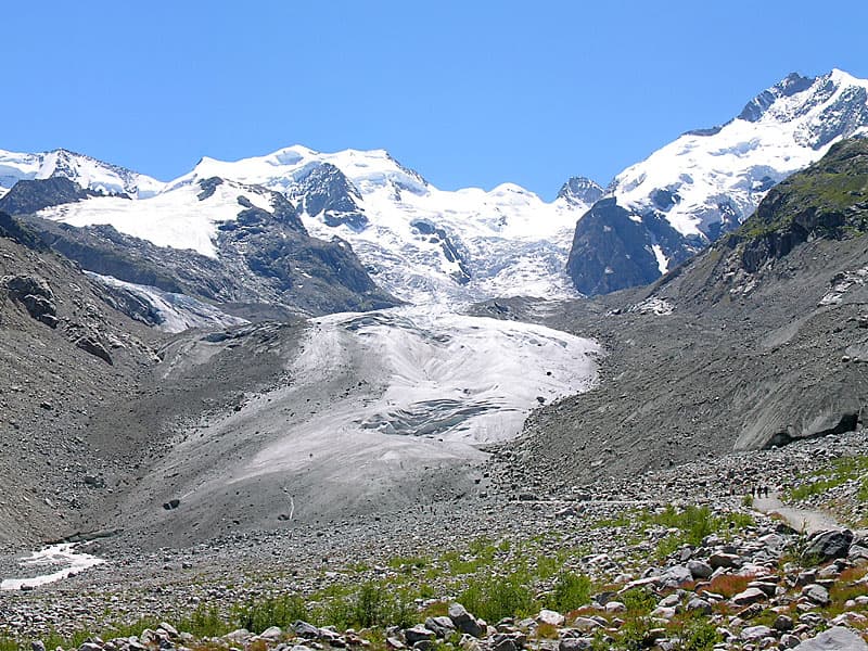 The Morteratsch Glacier, located near Pontresina, is one of the largest glaciers in eastern Switzerland and a vivid example of how climate change is altering Alpine landscapes. Between 1900 and 2017 the glacier has retreated over 8,000 feet. This distance is clearly illustrated with signs showing the glacier’s historic reach, turning the journey into a fascinating study of geology and global warming.