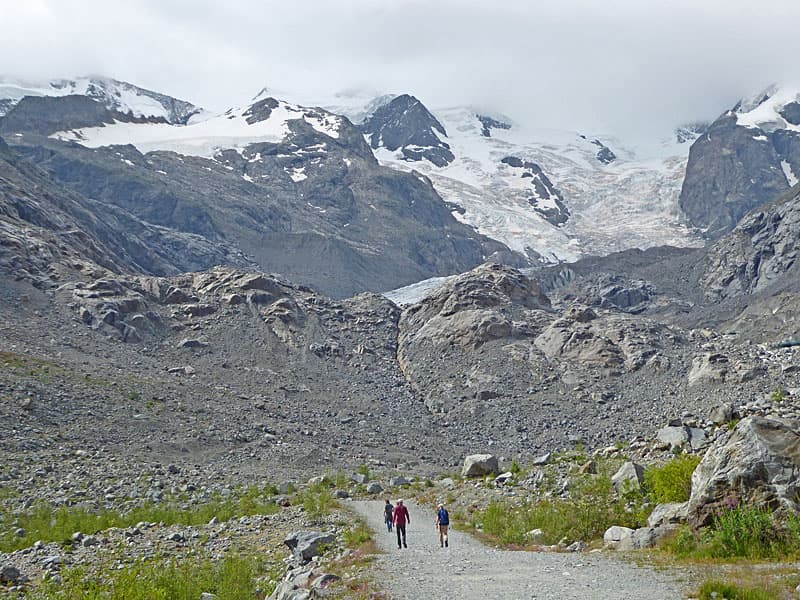 At 1.8 miles (400-ft of elevation gain) reach the end of the wide gravel path and the old viewing area. Braided channels of the Morteratsch River flow through the scree and curve around the viewpoint. A nearby marker places the farthest extent of the glacier in this area in 2015. Please note the sign warning of the dangers of rocks becoming dislodged from the glacier as it melts before you go any further.