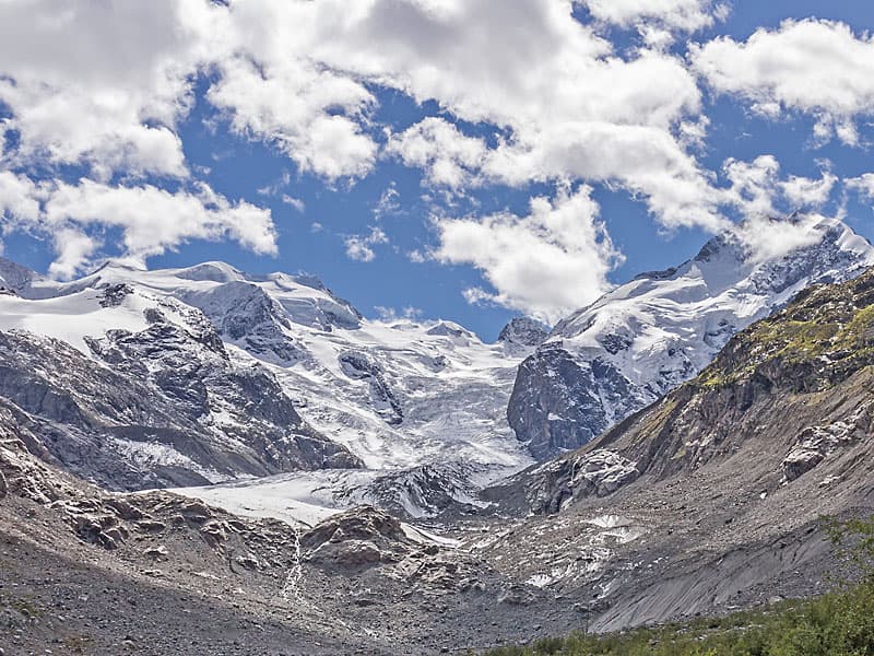 The trail initially follows a broad, easy path ascending the valley with great views of the ice-clad giants of the Bernina Range soaring above the head of the valley. Nearby the Morteratsch River rushes down the valley floor.